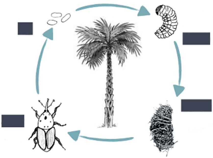تخم‌ها پس از چند روز باز شده و لاروهای سفیدرنگ بدون پا، با تغذیه از بافت‌های آوندی داخل تنه، حفره‌هایی عمیق ایجاد می‌کنند. این لاروها عامل اصلی تخریب بافت درونی و قطع جریان شیره گیاهی در نخل هستند. پس از پایان رشد، لارو درون پیله‌ای از الیاف خرما شفیره می‌شود و در نهایت حشره کامل از تنه خارج می‌گردد.