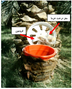• درون تله، قطعات الیاف خرما یا طعمه گیاهی مرطوب به‌همراه فرومون و مقدار کمی محلول اتانول–استات قرار داده می‌شود.