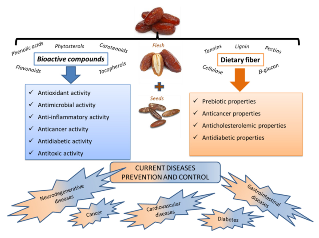 میوه خرما دارای خاصیت آنتی اکسیدانی قوی است. ترکیبات غالب میوه خرما شامل کربوهیدارت ها (قندهای ساده، گلوکز، فروکتز و ساکاروز)، پروتئین، اسیدآمینه (گلوتامیک، گلوتامین، آسپارتیک، آرژنین) و مواد معدنی (پتاسیم، کلسیم، منیزیم، آهن) است. این گیاه همچنین حاوی پلی فنول ها (اسید فرولیک، اسید هیدروکسی بنزوئیک، اسید کافئیک، اسید کلروژنیک)، آنتوسیانین و کارتنوئیدها است. میوه خرما از نظر تغذیهای بسیار غنی است و منبع خوبی از قندهای طبیعی (مانند گلوکز و فروکتوز)، فیبر غذایی، پتاسیم، منیزیم، آهن و ترکیبات آنتیاکسیدانی به شمار میآید. مصرف خرما موجب افزایش انرژی، بهبود عملکرد گوارش و تقویت سیستم ایمنی بدن میشود. به همین دلیل، این میوه نه تنها در رژیمهای سنتی بلکه در صنایع غذایی مدرن نیز جایگاه ویژهای دارد.