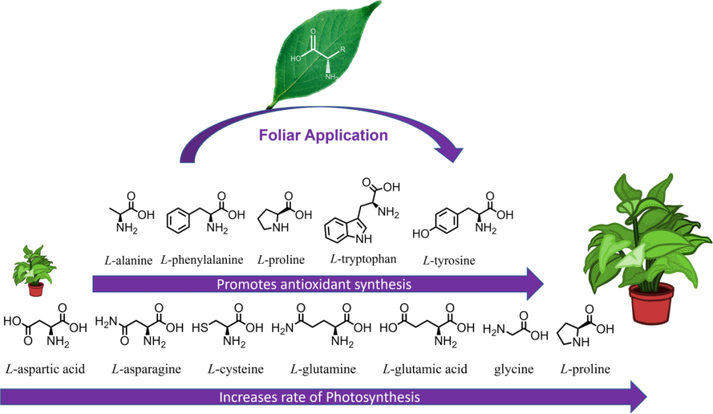 - محرک رشد: بعضی از آمینواسیدها (مثلاً آلانین، گلوتامین و اسیدهای آمینه آزاد حاصل از هیدرولیز پروتئینی) مسیرهای متابولیک را فعال کرده و تقسیم سلولی و تولید کلروفیل را تقویت میکنند.