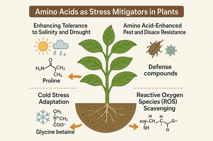 - بهبود مقاومت به تنشها : آمینواسیدهایی مانند پرولین نقش مهمی در تنظیم اسمزی، محافظت از غشاها و پاکسازی رادیکالهای آزاد دارند و در شرایط شوری و خشکی تجمع مییابند تا به حفظ تورژسانس سلول کمک کنند.